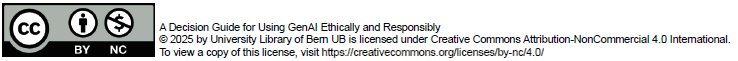 We are actively working on expanding this GenAI decision guide. If you would like to participate, share insights, or provide recommendations, please contact us: Medical and Natural Sciences Library: support_med.ub@unibe.ch or frnat.ub@unibe.ch